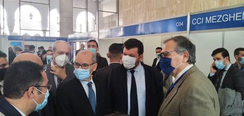 Monsieur Michel BISAC, Président de la CCIAF, accueil au niveau du stand de la CCI Algéro Française , Monsieur Hocine Cherhabil, Ministre de la Numérisation et des Statistiques , Monsieur Yacine Oualid, Ministre délégué auprès du Premier Ministre chargé de l' économie de la connaissance et des startup ; et Monsieur Karim Bibi Triki, PDG du groupe Algérie Télécom pour l'inauguration du salon ICTMAGHREB