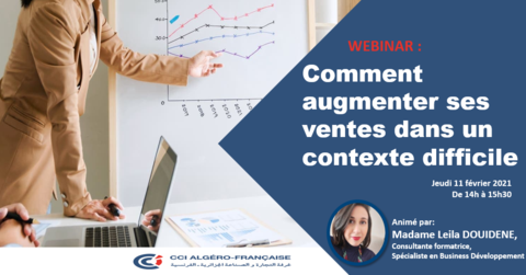 La Chambre de Commerce et d'Industrie Algéro-Française CCIAF et afin d'accompagner ses entreprises adhérentes dans leur développement notamment sur la partie commerciale organise un webinar le Jeudi 11 Février 2021 à partir de 14h00, un webinar sur comment augmenter ses ventes et quelle technique mettre en place.