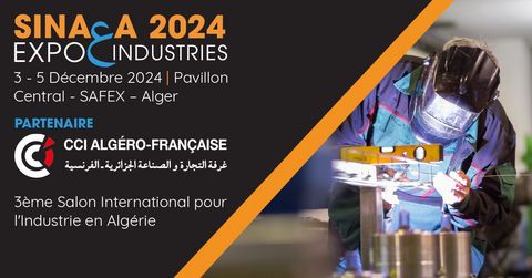 Nous avons le plaisir de vous annoncer que la Chambre de Commerce et d'Industrie Algéro-Française est partenaire du salon SINAA Expo Industries, considéré comme la plus vaste tribune internationale dédiée à l’industrie. La troisième édition de cet événement se déroulera au Palais des Expositions d'Alger (SAFEX), au niveau du pavillon Central, du 3 au 5 décembre 2024.